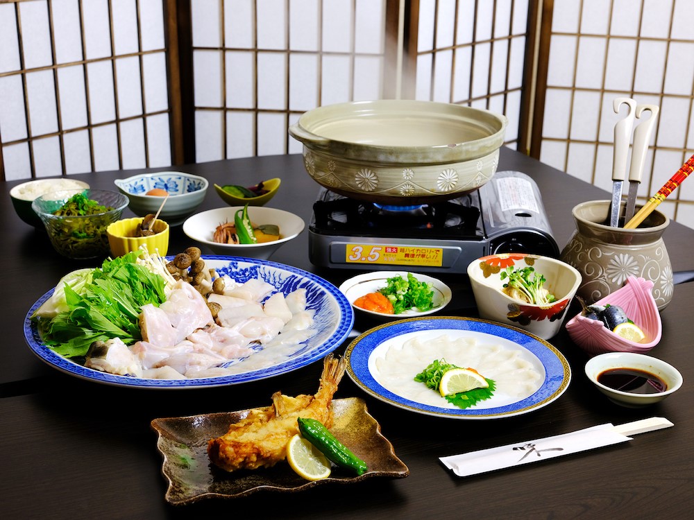 お部屋は和の趣きたっぷりのお座敷に、テーブルが3つとカウンター席があり、ランチ営業と、夜は1組限定の完全予約制となります。ふぐ料理と海鮮料理