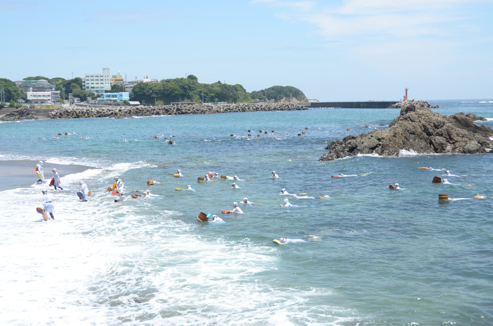 神事の後、海女が海に3回潜り、最後の1回はアワビの稚貝5000個を放流します。