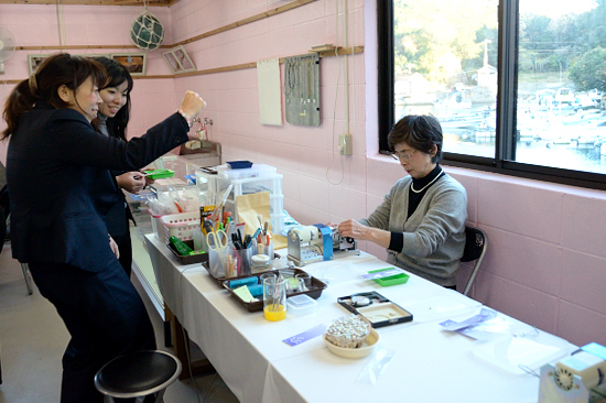 今日は風が強く、筏の上での取り出し体験は場所が変更になり、アクセサリーを作るお部屋で行われました。