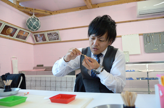 御座・烏賊浦で真珠の取り出し体験や、アクセサリー作りを体験することが出来る