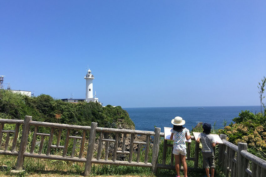 ※熊野灘と遠州灘を二分する大王埼灯台がある志摩市大王町は”絵かきの町”として知られています。大正2年、日本画家・土田 麦僊(ツチダ バクセン)が文展に発表して以来、段崖に打ち寄せる波、暗礁を照らす白亜の灯台とともに、藤島武二など沢山の画家たちに愛されてきました。夏休みになると合宿で学生さんたちもキャンパスと絵の具を持ちこみあちらこちらに点在します。