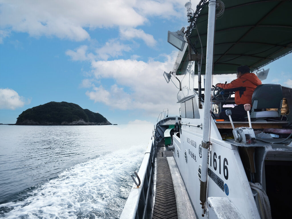 船が水しぶきをあげながら、葛島、三ツ石、逢原島を周遊し、所有されているトイレ付き筏も見せてくださいました。