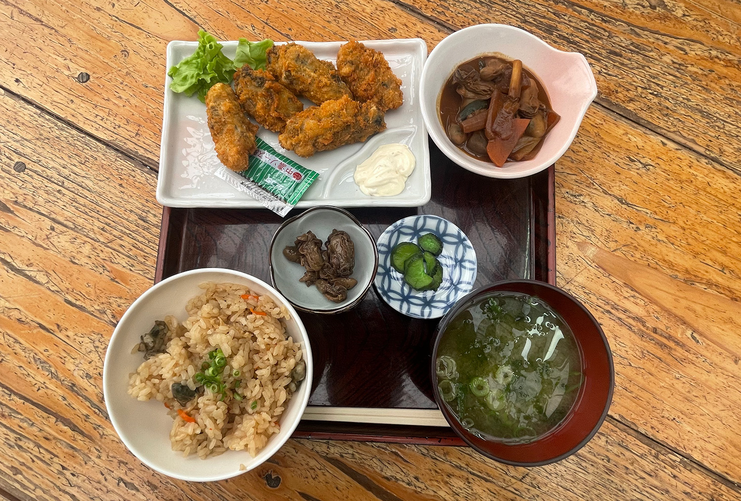 牡蠣フライ、かきの味噌煮、牡蠣ご飯、牡蠣とあおさの味噌汁をゆっくり味わいながら